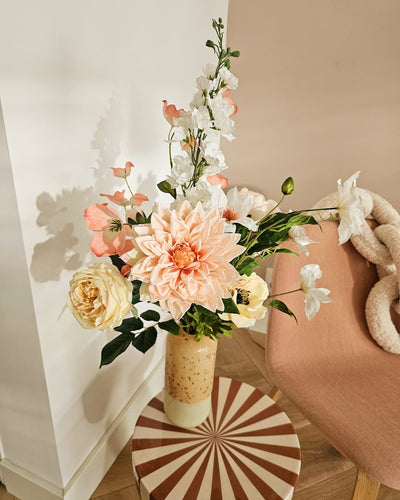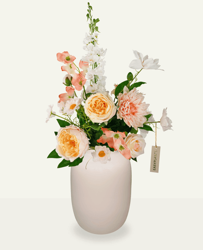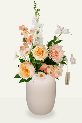 Ons Kunstboeket Powder Blush wordt vervaardigd met de meest hoogwaardige materialen om ervoor te zorgen dat het er realistisch uitziet en aanvoelt. Het gaat veel langer mee dan gewone planten of bloemen. Je hebt gegarandeerd jarenlang plezier van dit kunstboeket zonder dat de kleuren vervagen of het boeket zijn vorm verliest.