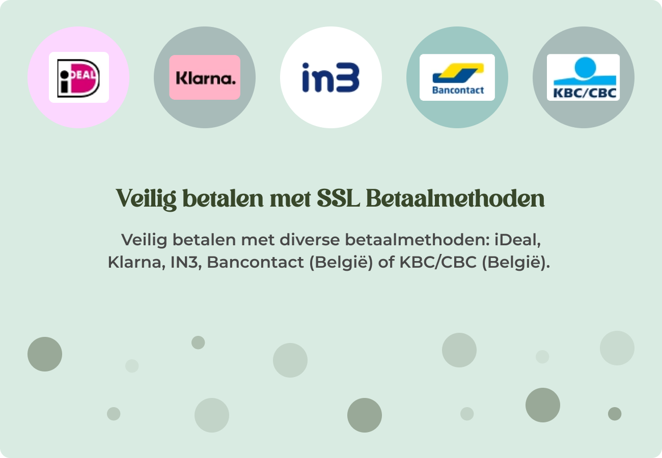 Je kunt veilig online betalen via verschillende methoden, waaronder Mister Cash/Bancontact, bankoverschrijving, PayPal, creditcard (Visa of MasterCard), iDEAL en Klarna. Bij een bankoverschrijving worden onze bankgegevens getoond bij het afrekenen en zijn ze ook vermeld op de factuur die je per e-mail ontvangt. Klarna biedt de mogelijkheid om achteraf te betalen. Alle betalingen worden afgehandeld door onze betalingsprovider Mollie, wat zorgt voor een snelle en veilige transactie.