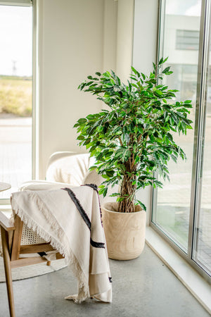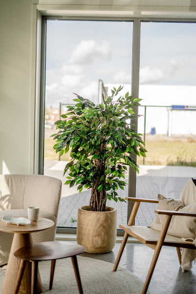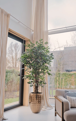 Onze kunstplanten zijn nauwelijks van echt te onderscheiden dankzij het gebruik van hoogwaardig polyester en stammen van echt hout, wat zorgt voor een natuurlijke uitstraling. Ze vergen weinig onderhoud; af en toe afnemen met een zachte borstel of vochtige doek houdt ze fris en mooi. Met een levensduur van 10 tot 15 jaar zijn onze kunstplanten bovendien een duurzame en langdurige keuze.